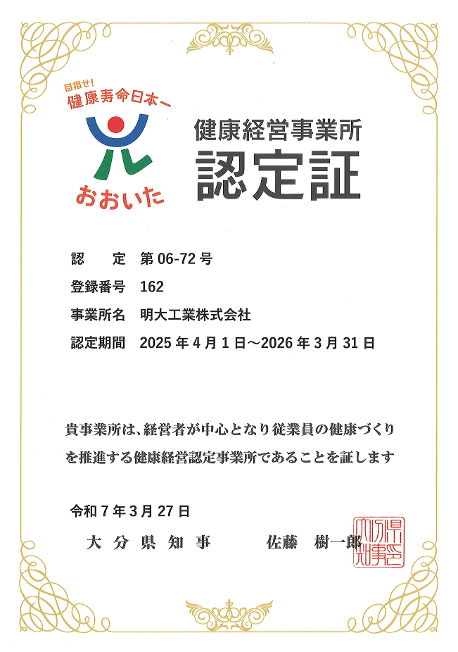 当社は、『良い仕事 まずは心と体の管理から』というスローガンのもと、平成28年に大分県から『健康経営事業所』として認定され、この年の10月に優秀健康経営事業所として知事顕彰を受けました。